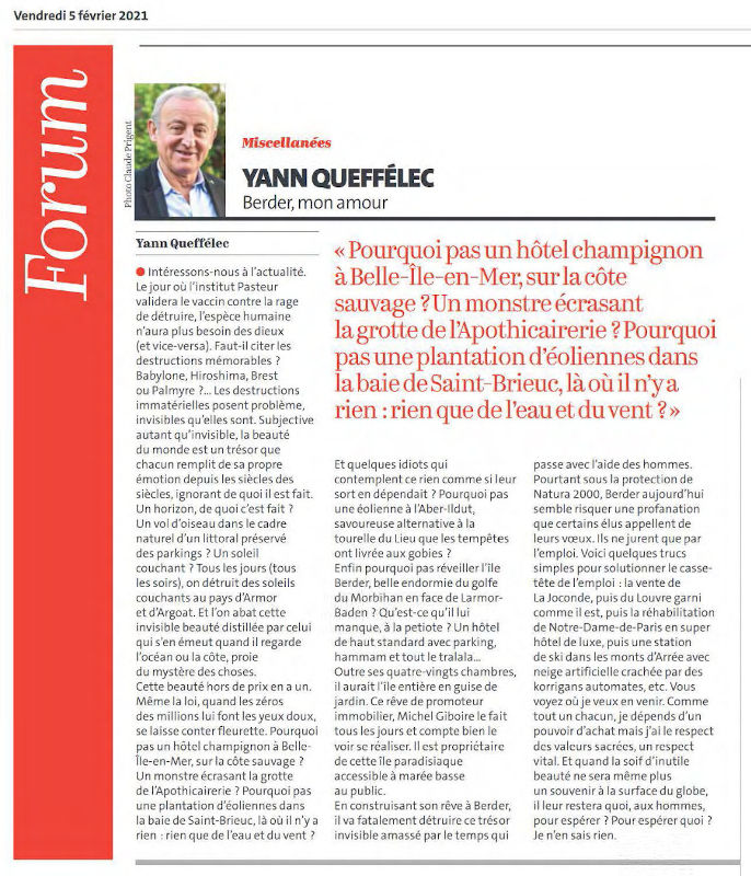 Berder pendant des années a été un formidable centre d’accueil, pour les familles, les enfants, et des séminaires de tous types. Les témoignages recueillis par notre pétition qui a rassemblé 15.000 signatures à ce jour évoquent des souvenirs de milliers de gens qui ont eu la chance de séjourner dans cette île de liberté et de beauté. Évidemment, un hôtel 4 étoiles et son parc de 23 hectares qui prend la totalité de l'emprise de l'île en dehors de son chemin côtier où les promeneurs derrière un grillage pourront continuer à cheminer, est un projet d'une grande audace en termes d'aménagement du territoire, certainement formidablement bien réfléchi, et qui répond aux besoins de notre territoire ! Alors s'il vous plaît monsieur le rédacteur en chef, même si je ne me sens pas offensé par le trait d'humour de votre rédaction, acceptez de recueillir une interview de notre collectif qui vous expliquera pourquoi nous ne laisserons "pas béton"...