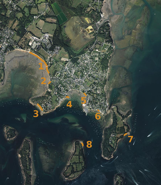 1 - la plage de Locmiquel, 2 - la plage du Paludo, 3 - la plage de Berchis, 4 - la plage de Port Lagaden, 5 - la plage de la Fontaine, 6 - la petite plage de Pen Lannic, 7 - la plage de Berder, 8 - la plage de Gavrinis
