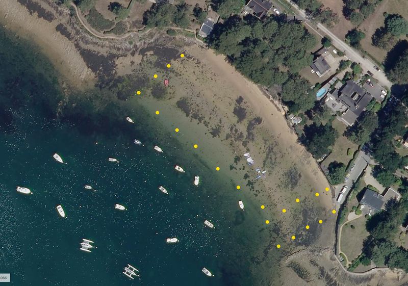 Vue aérienne de la plage : au nord des enrochements, au sud, quelques enrochements, à l'ouest, des mouillages