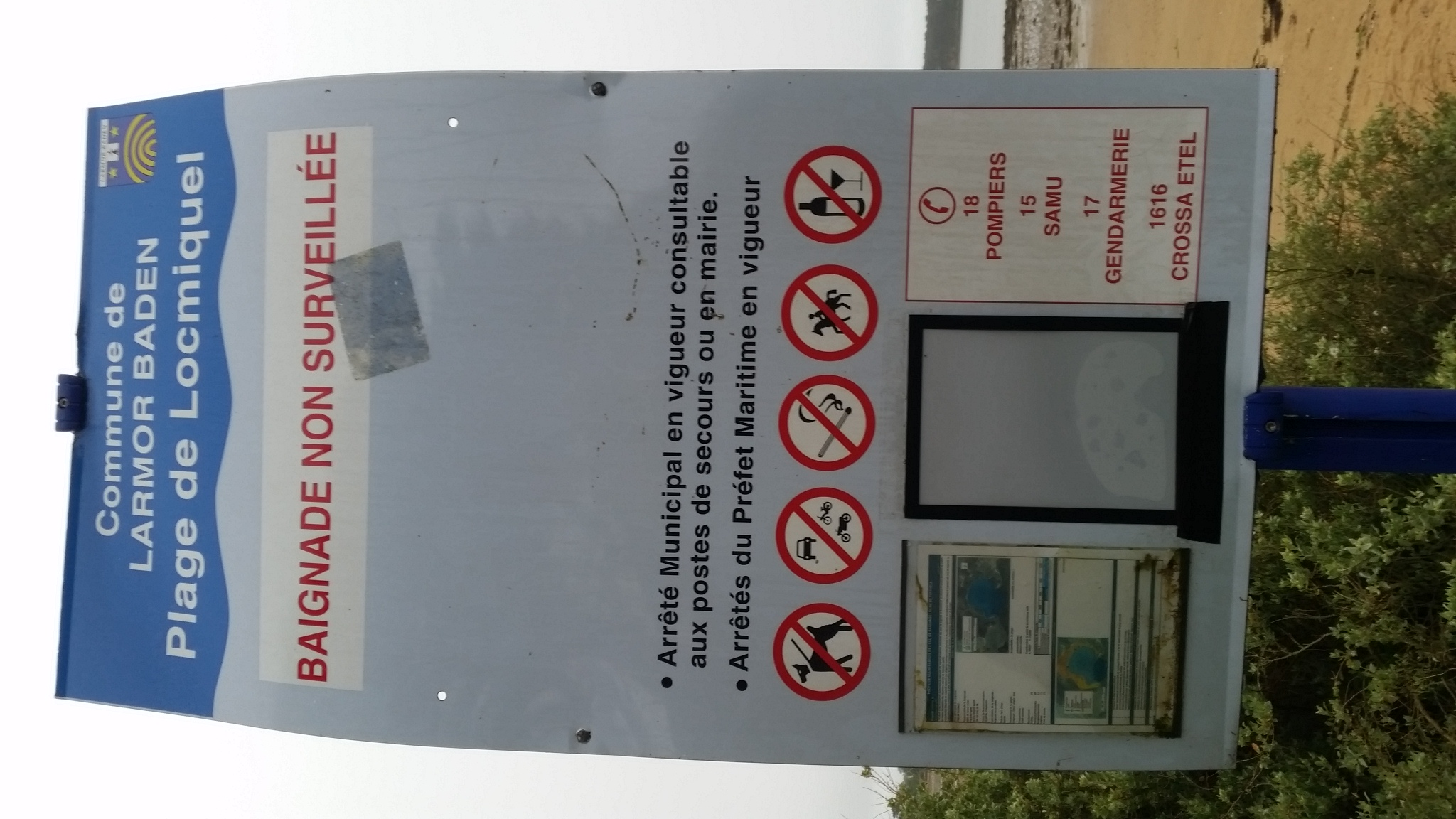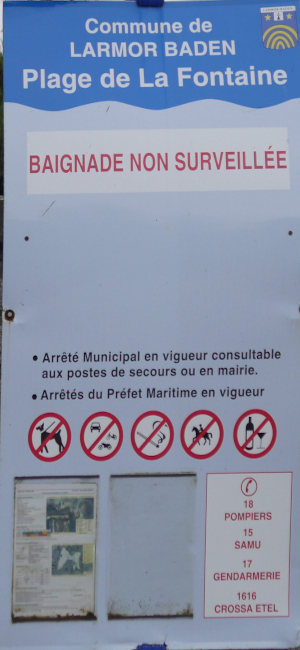 - compléter le panneau indiquant que le plage n'est pas surveillée par une indication des dangers et de l'interdiction de la baignade dans le chenal réservé aux bateaux à moteur (voir intallation sur la plage est de l'île de Houat).