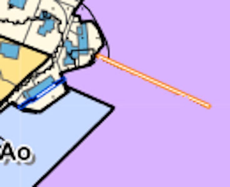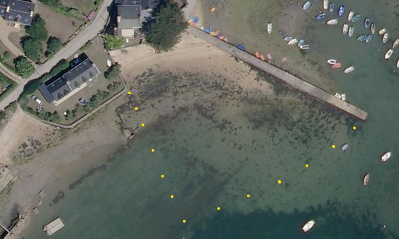 Vue aérienne de la plage de Port Lagaden : au nord, limitée par la jetée, sur laquelle il est possible de positionner un bateau, ou de caréner (voir règlement du port), au sud, les mouillages du port, à l’ouest, un parc ostréicole et une zone réservée.
