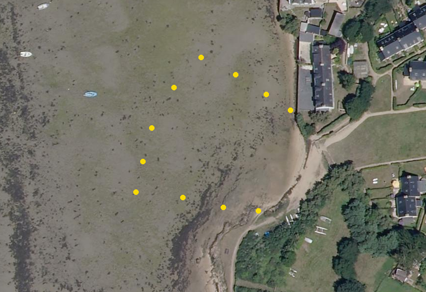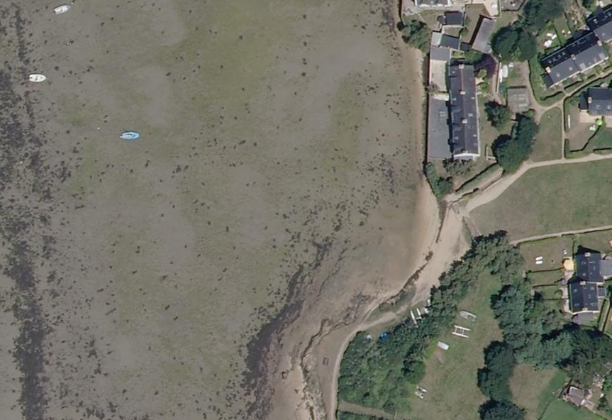 Vue aérienne de la plage : au nord, une vasière, au sud, quelques enrochements, à l'ouest, des mouillages sur vasière (plates).